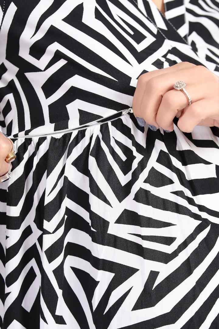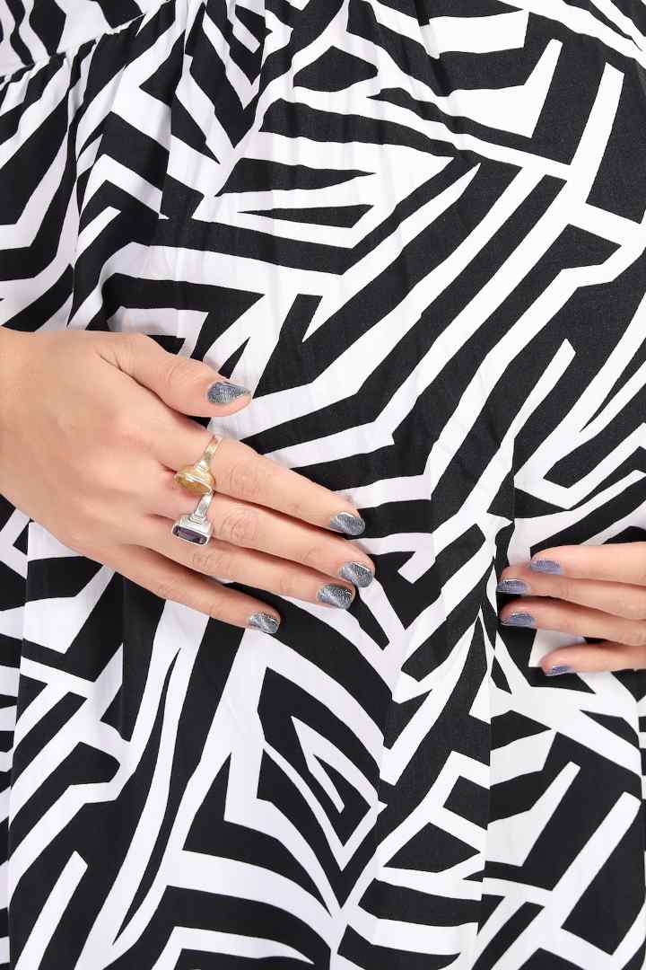 This super dress is a must-have for any expecting mother. With the woven structure , it is perfect and breathable The dress is made from high-quality material that is soft and comfortable on the skin, ensuring maximum comfort throughout your journey.The geometric print hides the bump cleverly and you can walk out in style. This is an OG black and white style