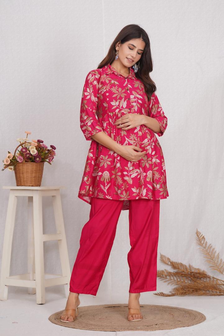 This rich Chanderi Modal Nursing Coord Set with a regular collar is a perfect maternity wear for any occasion. The feeding zippers on either side aid in feeding anytime , anywhere on the go. The sheen in the fabric makes you dazzle.