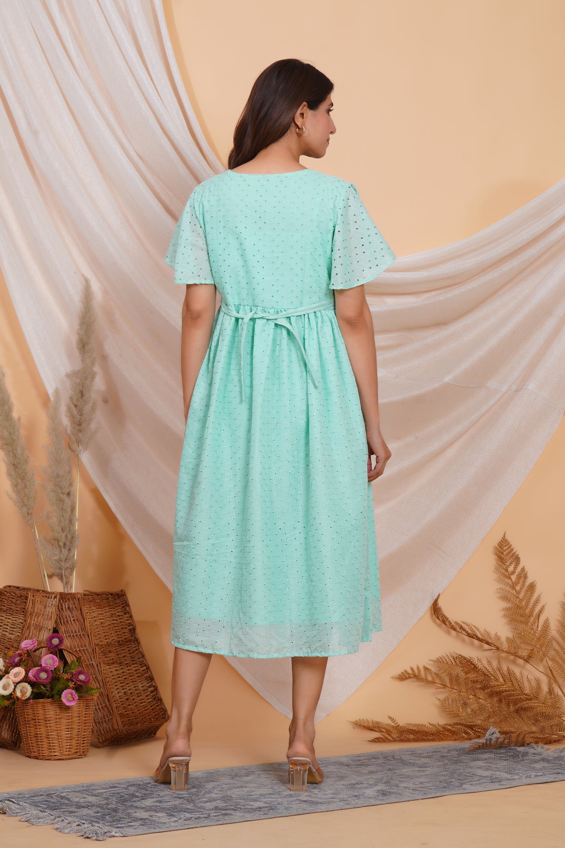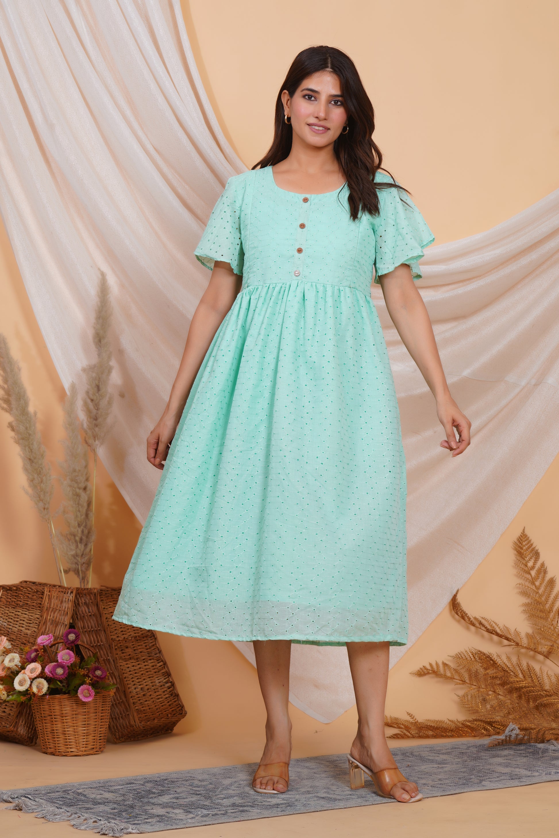 Make heads turn with this Comfortable Cotton calm blue Maternity/Nursing Dress. This has feeding zippers on both sides for easy nursing. The flare sleeves give a feminine touch and elegant look. This dress comes with a lining and is perfect for any occasion. The subtle Chikankari design adds to the grace.