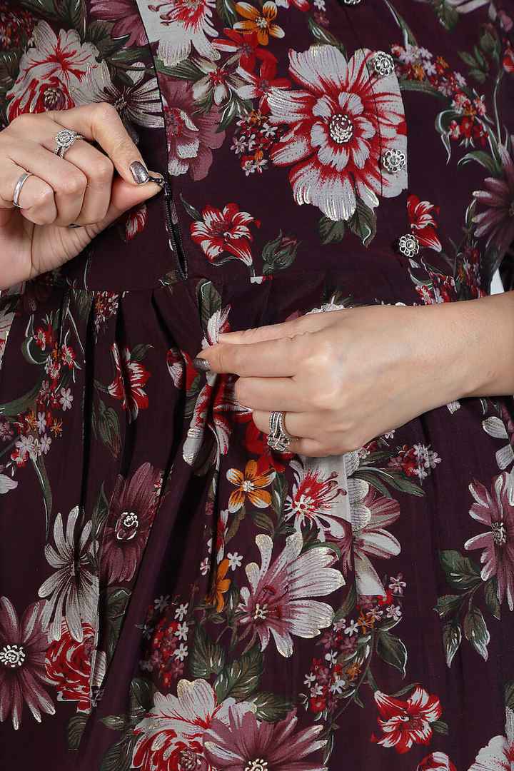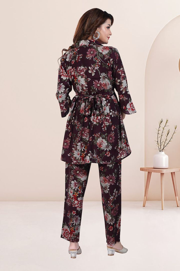 This Chanderi modal Co'ord set is a must-have for any expecting mother. With its camp collar and stunning floral foil print, it adds the style quotient