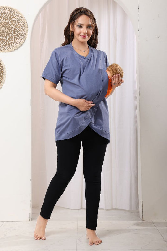 If you want to slip into those types of denim after wearing those age-old maternity clothes, this 4-way stretch denim is perfect for maternity wear. The cool gray color pant matches any top or kurtis. The 8-inch over-the-belly band stretchable band keeps your belly protected and gives a nice shape overall.