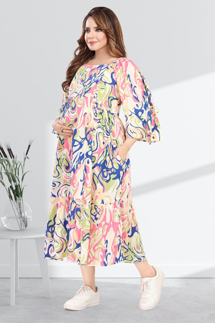 This super dress is a must-have for any expecting mother. With the woven structure , it is perfect and breathable The dress is made from high-quality material that is soft and comfortable on the skin, ensuring maximum comfort throughout your journey.The geometric print hides the bump cleverly and you can walk out in style. The quirky print makes it worth the buy.