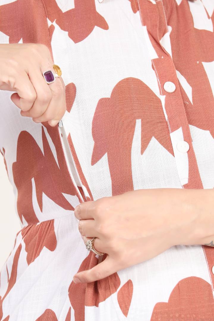 This super dress is a must-have for any expecting mother. With the woven structure  , it is perfect and breathable The dress is made from high-quality material that is soft and comfortable on the skin, ensuring maximum comfort throughout your journey.The geometric print hides the bump cleverly and you can walk out in style. The textured linen ensures good breathability and comfort.