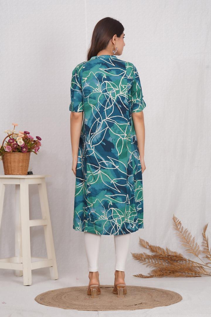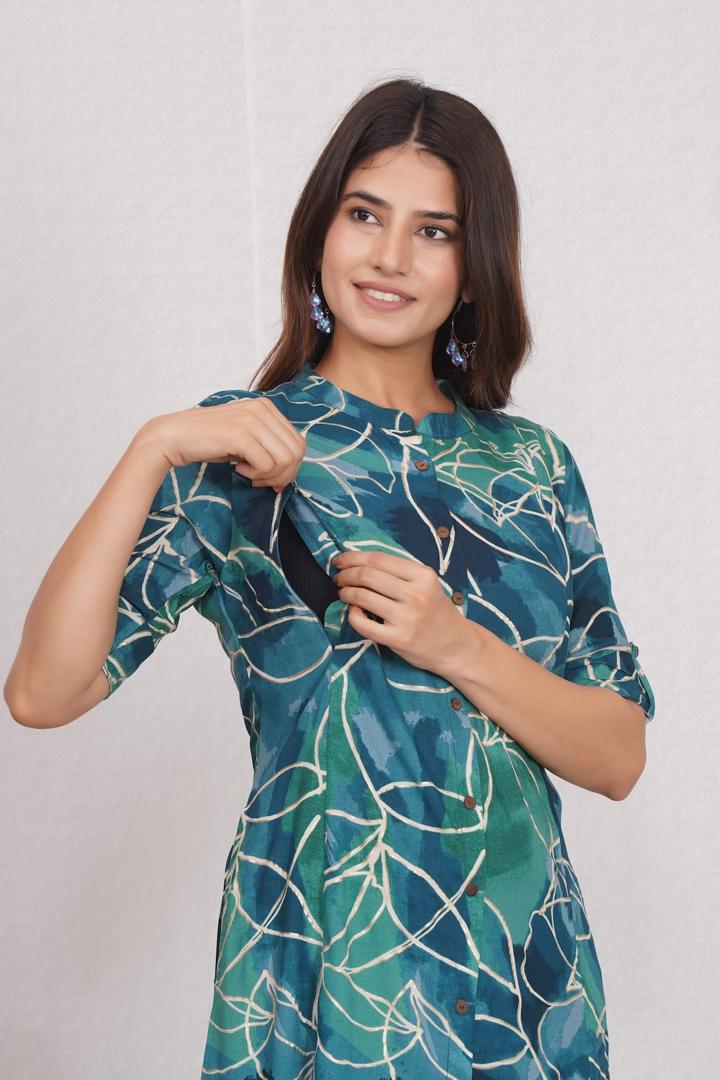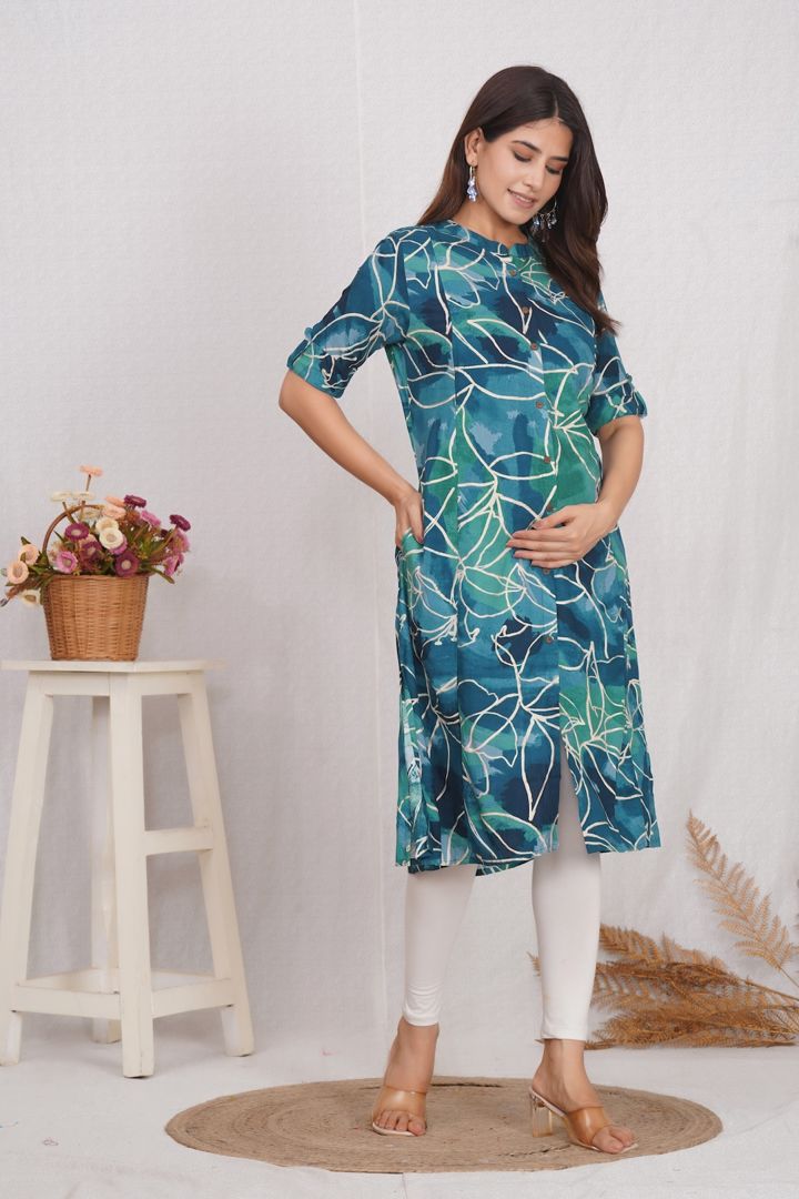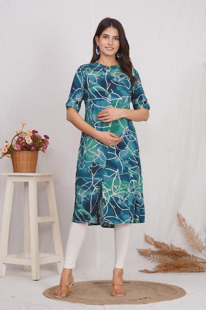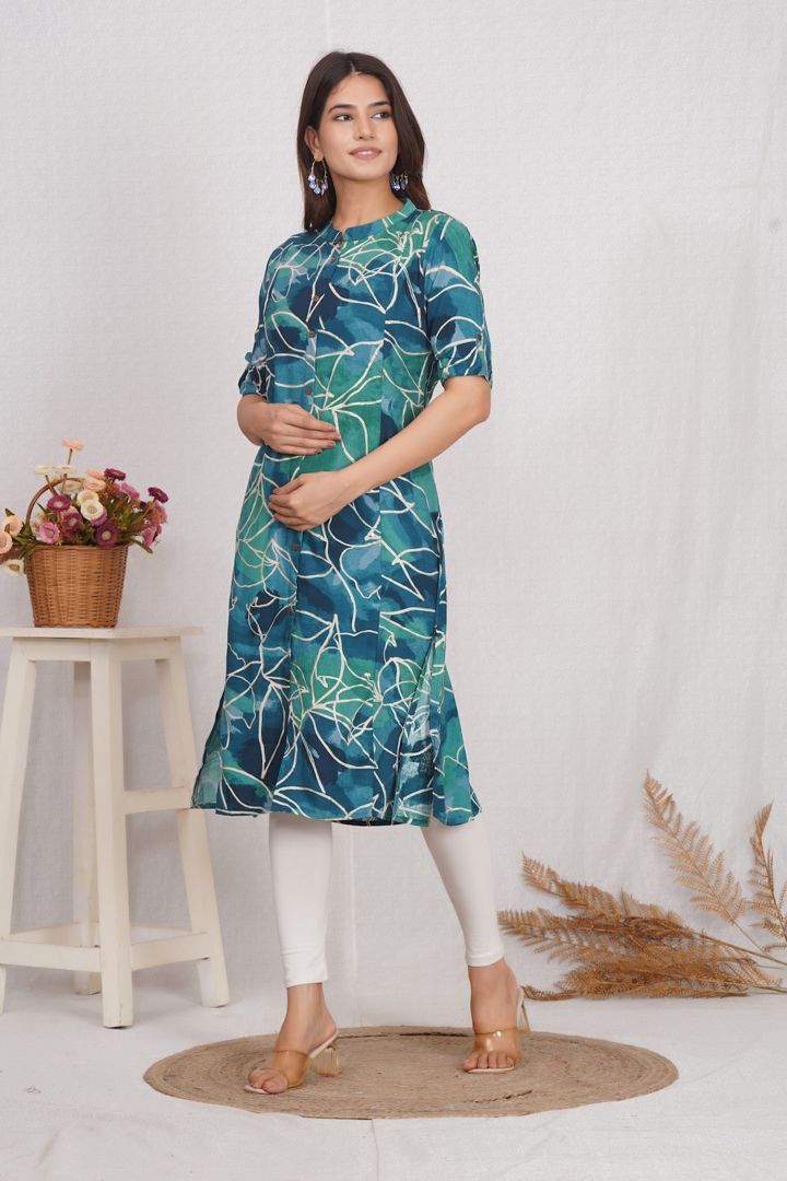 This A line Kurti has two feeding zippers on both sides for hassle free feeding . This is our design which has been crafted inhouse. The rayon material is perfect to create the smart look. The Chinese collar gives a sophisticated touch .