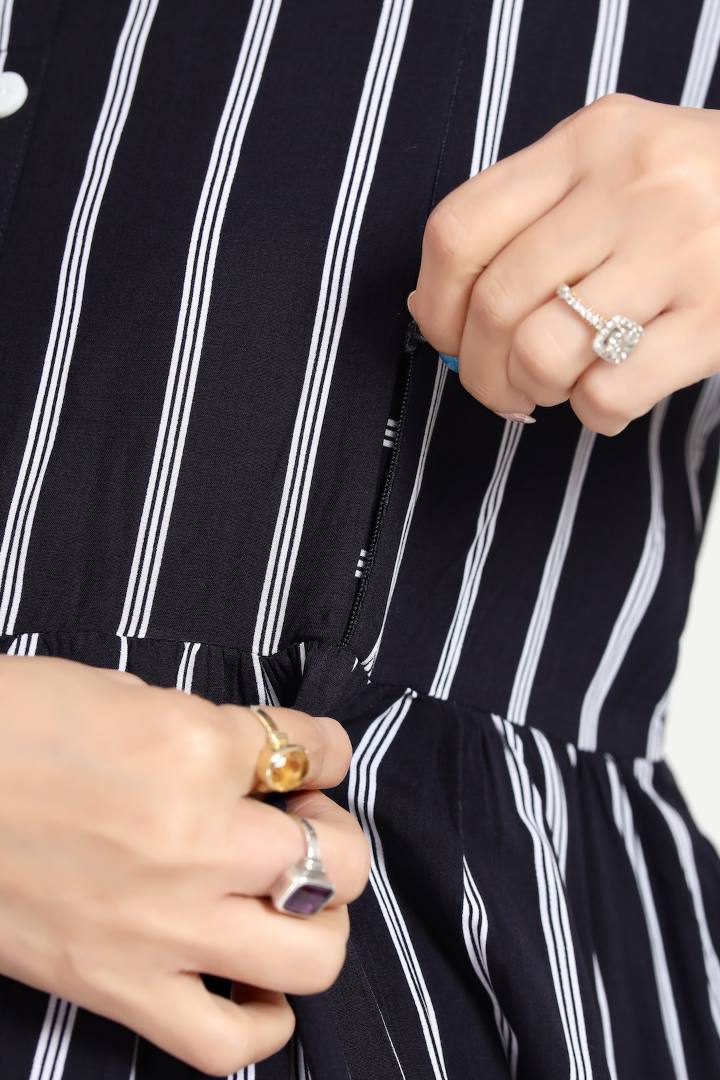 This Striper dress is suitable for any outing or even for a cute photoshoot .  The feeding hidden zippers on both the sides make it easy to feed discreetly . the tie up at the back and the gathers support the growing belly . Do check out this piece for style and comfort
